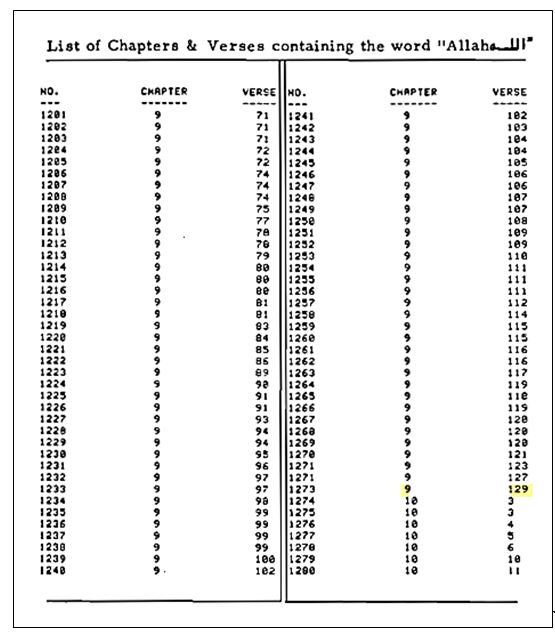 Figure 2. An image from Rashad Khalifa's book (1982) on the computational method for counting Allah in Surah al-Tawbah.